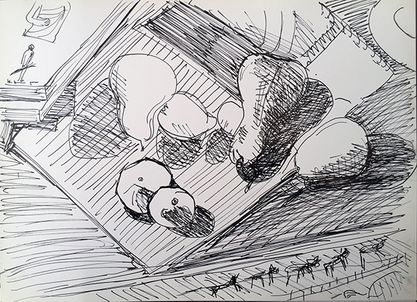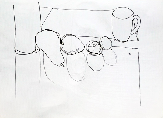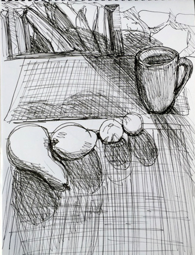 Nach einem langen Spaziergang mit einer Freundin und dem Hund Tito besah ich mir die beiden Zeichnungen. Dann legte ich den Block mit der zweiten Zeichnung auf den niedrigen Couchtisch und das Obst auf den Block, um es noch ein drittes Mal zu zeichnen. In den Bildausschnitt gerieten zudem die Ecke von drei gestapelten Büchern, der Kreisabschnitt eines Tellers und ein Stück des Teppichs mit gewebten Tieren.
