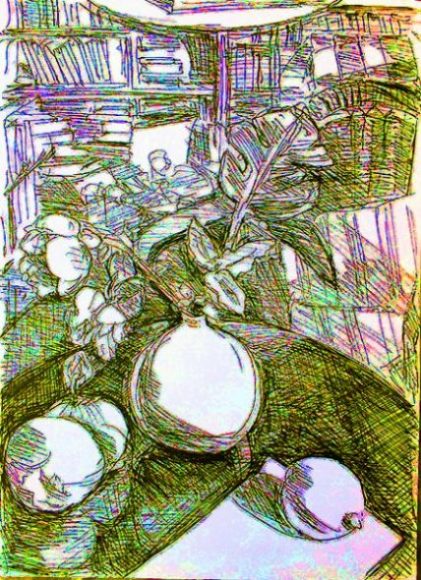 Obst 7 und Vase (tägliche Zeichnung, schwarz-weiß und farbig)