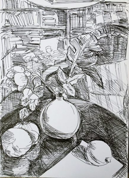 ← Obst 7 und Vase (tägliche Zeichnung, schwarz-weiß und farbig)