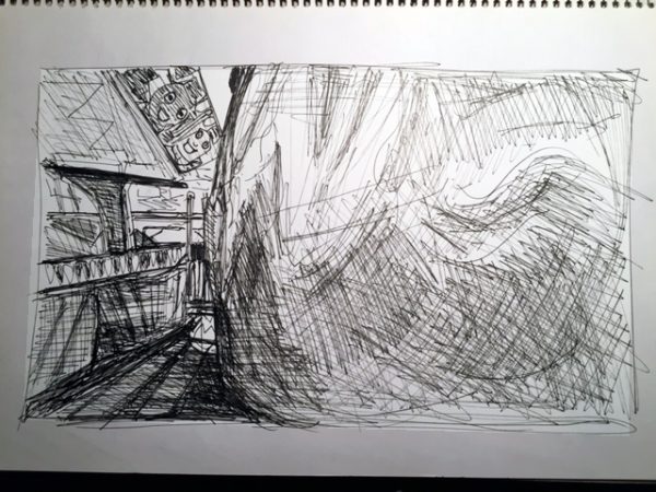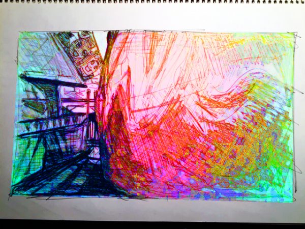 Das fünfte Foto setzte ich in meine tägliche Zeichnung um. Da ich die Zeichnung unter der Lampe fotografierte, ergaben sich Rottöne, die ich digital nur zu verstärken brauchte, um den Lunapark-Effekt zu erreichen, der ein kindliches Herz höher schlagen lässt.