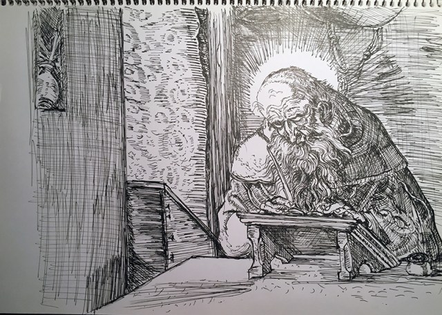 Nun, ich hatte diesen alten Mann nicht vor mir, doch ist die Lebendigkeit, die Dürer ihm gegeben hat, auch in meiner Kopie nicht verloren gegangen. Ich fühlte, als ich sie zeichnete, die rauen schmerzenden Hände, die die Feder halten, das aus grobem Material zusammengesetzte Mönchsgewand, die konzentrierte Aufmerksamkeit, mit der er bedenkt, was er in seinem  Brief schreiben wird.