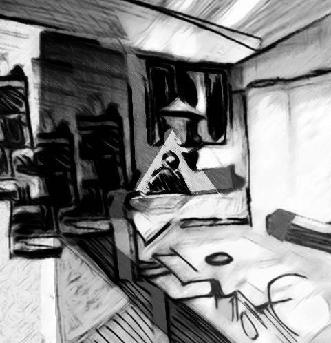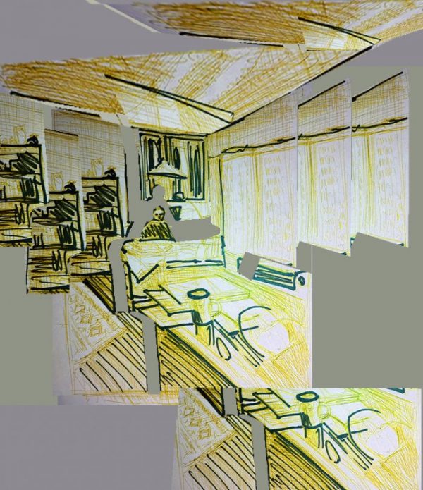 Dann habe ich die Hauptlinien mit dickerem Filzstift nachgezogen und die Zeichnung digital zerschnitten und neu zusammengesetzt. Ein elegantes architektonisches Büro ist entstanden.