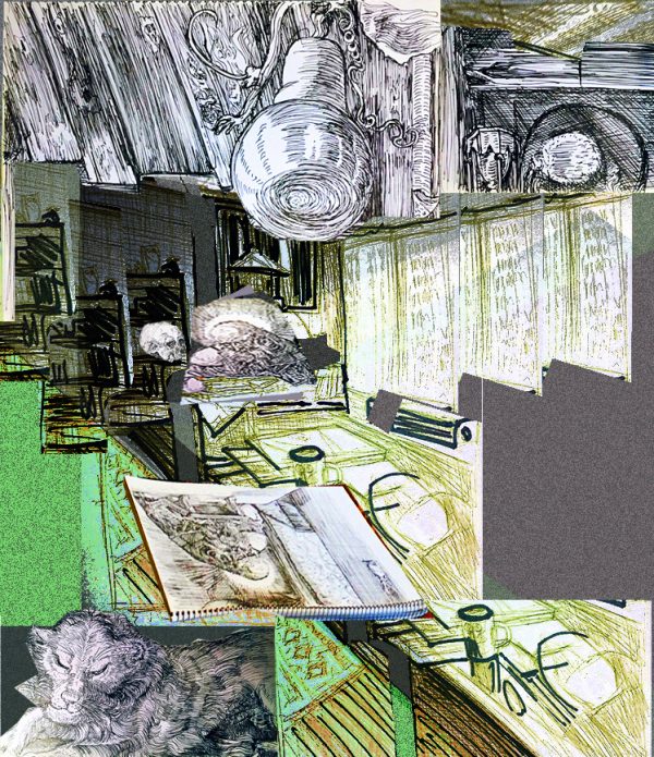 Der Heilige Hieronymus in unserem Gehäus. Foto-Collage aus Zeichnungen, 180 Grad gedreht, 2020-02-06
