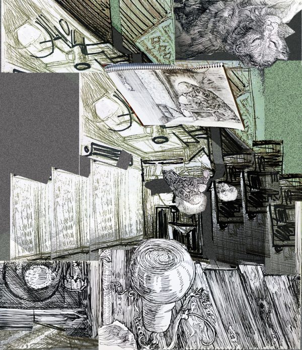 ← Hieronymus in unserem Gehäus (alltägliche Zeichnung und Foto-Collage)