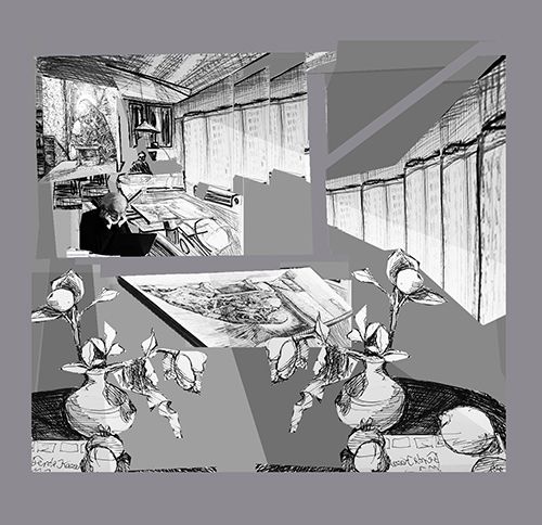 Schließlich habe ich noch ein Elemente aus einer Zeichnung vor dem Kamin hinzugenommen (Vase mit verblühter weißer Rose, Früchten und Briefumschlag). Bitte anklicken.