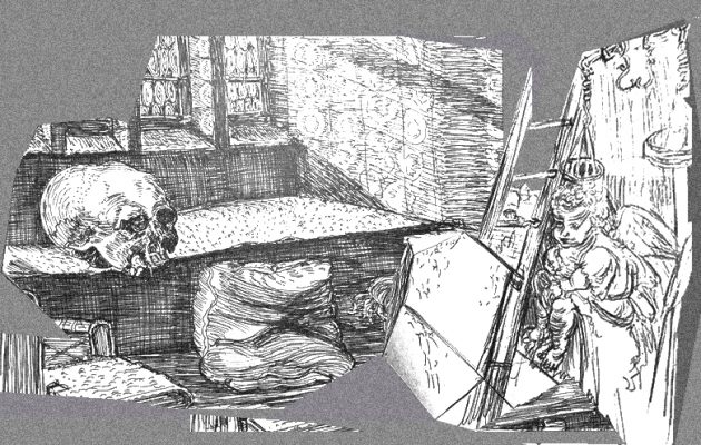Ich hatte sie zuerst frei flukturierend, aber da verlor sie sich im Raum. Also habe ich sie gerahmt. Die beiden – Putte und Totenschädel – sollten sich dennoch ganz gut verstehen, denn sie sind beide von Dürer, aus derselben Schaffensperiode. Ich dachte, du würdest das Bild vielleicht erkennen, aus dem die Putte stammt.