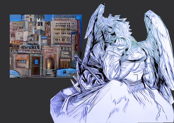 Viele weitere Collagen mit dem Dürer-Engel habe ich ausprobiert. Schließlich kam ich auf die Idee, den Engel nicht in, sondern neben oder vor einige meiner früheren Gemälde zu setzen. Würden meine Bilder unter dem prüfenden Blick des Engels standhalten? Wie würden sich die zu verschiedenen Zeiten, mit unterschiedlichen Medien und Absichten erstellten Bilder vertragen? Die Zeichnung des Engels habe zu dem Zweck etwas bearbeitet.