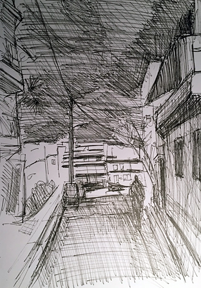Das Foto habe ich mir aus der letzten Serie herausgesucht – überraschend, wie eine Zeichnung die Situation völlig anders deuten kann: hier finde ich sie viel chaotischer und düsterer als in der fotografierten Fassung.