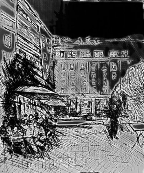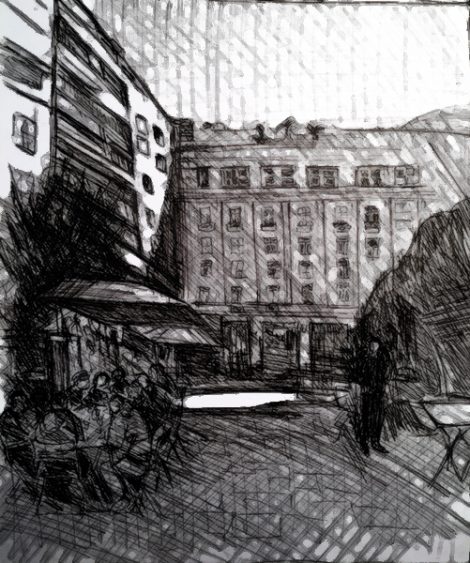 Deine architektonischen Skizzen wirken auf mich wunderbar locker-leicht. Durch die einzelne Gestalt kommt in den ersten beiden Bildern faszinierende Spannung rein , die sich im Dritten mit der sitzenden Gruppe in Gemütlichkeit und Flanieren auflöst. Toll!