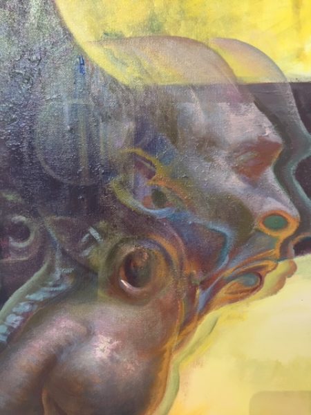 Die Bilder sind sehr groß. Das erste heißt: „Lets get married“. Beim zweiten ist ein kleineres „Heile-Welt-Bild“ans Hauptwerk angeklebt. Diese beiden sind mit Akryll auf Leinwand gemalt. Das dritte „FTW 2018“ betitelt, ist eine Zeichnung (Bleistift, Filzstift, Pastell) mit Collagen auf Papier. Ich zeige dann noch drei Bildausschnitte, die den Malstil verdeutlichen-