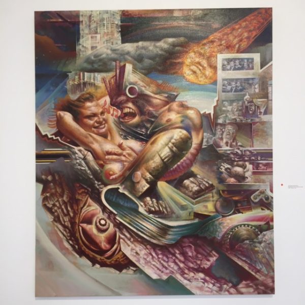 Bei diesem Ansatz ist es dann nicht erstaunlich, dass der Maler Fortschritt nur in seinem dystopischen Aspekt wahrnimmt. Mit geradezu altmeisterlichem Können entwirft Moschos Bildwelten, die würgen, ekeln, „ankotzen“. Mich interessierte wegen eigener aktueller Versuche (Raum-Zeit-Collagen), wie er seine Bildwelten aufbaut. Ich fand allerdings außer dem Malstil (fast altmeisterlich mit modernen Effekten) keine zeitliche Dimension, sondern nur eine zerstückte Jetzt-Welt mit deformierten Menschen. „Trittst du hier ein, lass alle Hoffnung fahren“ – dachte ich, Dante zitierend.