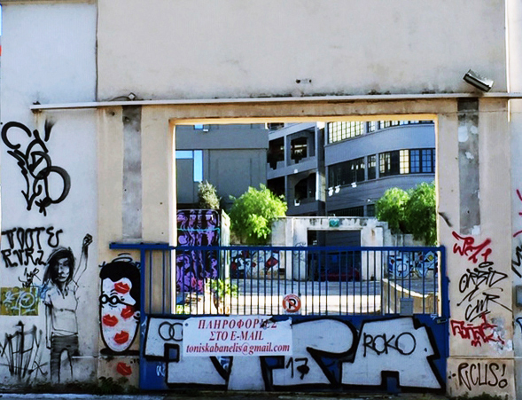 Zunächst das Originalfoto: Gerahmt von einer Wand mit allerei Spray-Kritzeleien spiegelt sich die Fassade eines modernen Bürohauskomplexes. Wir befinden uns in einer sogenannten unterbewerteten Gegend Athens nahe am Omonoia-Platz. Immer wieder unternahm man Anläufe, ihr ihre frühere Geschäftigkeit zurückzugegeben. Gelungen ist es bisher nicht.