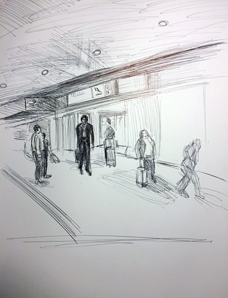 Da ist zunächst die Vorgabe der Wörter und Regeln der abc-Etüden, in diesem Fall „Sonnenuntergang, warm, fliegen“. Zu dem aktuellen Bild, mit dem ich mich gerade befasse (Musiktheater 131), gesellt sich die Erinnerung an die Szene, die ich im Dezember des Vorjahres am Flughafen aufnahm und gestaltete. Mein Ausgangsmaterial sind also zwei von Fotos abgeleitete Zeichnungen: (No 1) Flughafen, (No 2) Musiktheater.