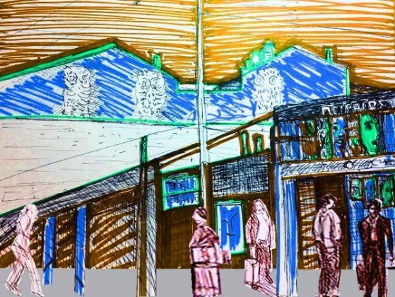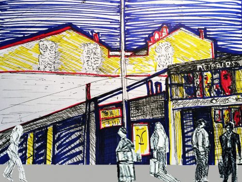 Ich überarbeite nun die Schwarzweißzeichnung No 2 mit gelbem, rotem und blauem Filzstift. Die Figuren von No 1 schneide ich einzeln aus und füge sie in die farbige No 2 ein. Damit sie mehr Raum haben, verlängere ich die Zeichnung nach unten und füge einen grauen Streifen ein. Zugleich schneide ich ein Stück Himmel ab. Dadurch wird das Augenmerk nach unten, zu den Menschen hin gelenkt. Den Figuren gebe ich eine andere Position als im Ausgangsbild. Meine „Heldin“ mit dem Koffer stelle ich in die Mitte.
