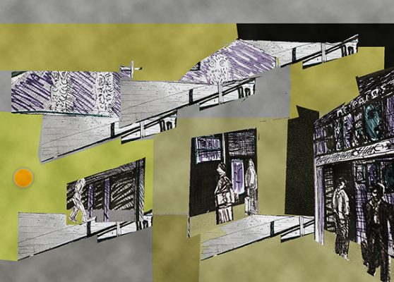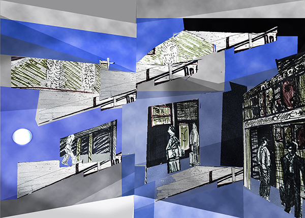Aber das ist mir zu eng und der Bildaufbau zu konventionell. Also beginne ich, das Bild zu zerschneiden, Teile davon zu kopieren und zu vervielfältigen, und das ganze Raumgefüge neu zu ordnen, verändere das Format, experimentiere mit den Farben, füge Wolken ein, die das Bild ein wenig unheimlicher machen, um dem unsicheren Gefühl meiner Heldin – Verlorenheit, Bedrohung – zu entsprechen.
