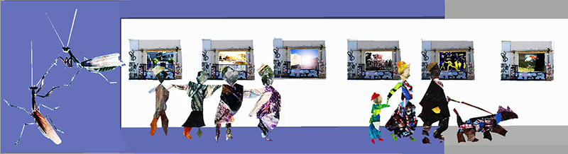 Die Inhalte der Galerie, an der die Leute vorbeiziehen, habe ich nicht angepasst.  Sie repräsentieren die Gegenwart, obgleich die gezeigten Bilder ebenfalls große Zeiträume und sogar ein Stück Natur (die Fische im letzten Bild) umfassen.  Den Leuten aber ist es schnurz. Bilder halt. Der Künstler wird sich was bei gedacht haben, aber er ist nicht da, um ihn zu befragen.