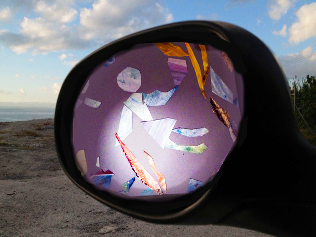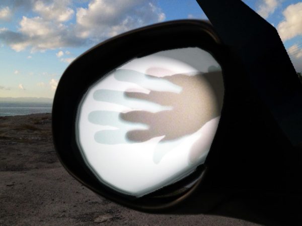 Ja, der Blick zurück hat was. Hier erscheinen im Rückspiegel allerdings nicht meine Werke und Erinnerungen. Der Rückblick gilt Verstorbenen: wie blicken wir auf sie. Was bewahren wir von ihnen wie. Die Skulpturen halten besondere Eigenschaften des Verstorbenen fest: Krieger, Mütterlichkeit. Oder wir sehen sie als Seelen aufsteigen, denen noch die Farben ihrer Taten anhängen (zu Lebzeiten helle, dunkle, reine, durchmischte Charaktere) . Oder wir sehen sie als Lebensgeschichte in Bezug auf uns selbst (mein Freund wurde erschossen, ich habe ihn verloren), oder, vielleicht, auch im Symbol: Schattenhand auf Lichthand. …..Es gibt viele Möglichkeiten. So hab ich es gemeint.