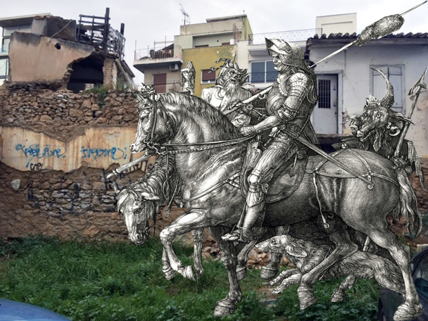 Wo die Angst herrscht. Dürers Ritter-Tod-und-Teufel begegnen dem Blumennarr (Collage)