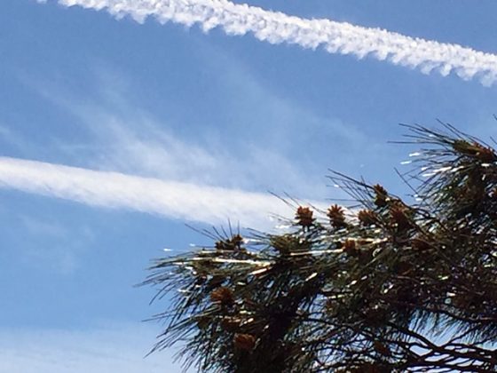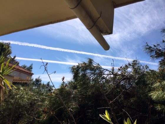 Vor drei Tagen noch war es herrlich sonnig und warm, ja sogar etwas zu heiß. Am Samstag saßen wir zum Mittagessen auf dem Balkon, kurzärmlig, um Vitamin D zu speichern. Plötzlich machte mich mein Mann (der wirklich gar nichts von Spray-Theorien hält) erstaunt auf ein Himmelsphänomen aufmerksam, das ich von meinem Platz aus nicht sehen konnte. Ich stand auf und sah extrem kräftige breite Kondensstreifen.