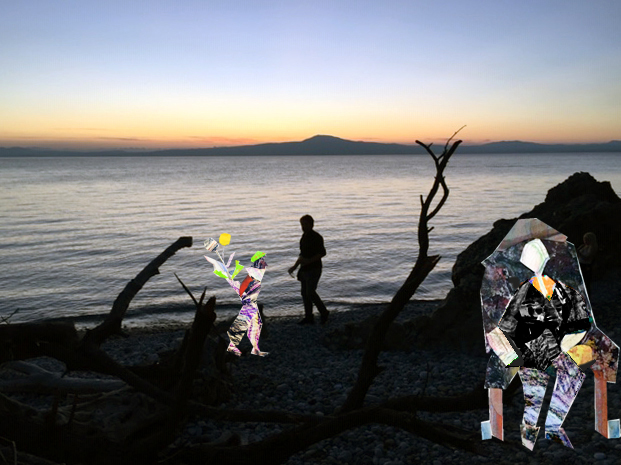 Noch ist er gesichtslos… also erst noch individuell zu „füllen“. Hinter ihm, in seinem Rücken, dort wo die Inspirationen herkommen: der Narr, der IMMER die Wahrheit, vor allem die unbequeme, sagt. Und das weite, immer sich in Bewegung und Verwandlung befindende Meer…