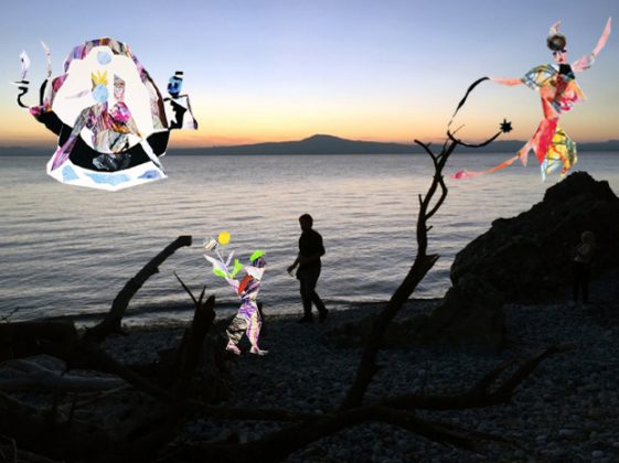 Zunächst konzentrierte ich meine Suche auf eine abstrakte Darstellung von „Beziehungen“, wie diese digital bearbeitete Mischung aus Zeichnung und Legebild. Sonne, Meer, Strand: Liebe liegt in der Luft.