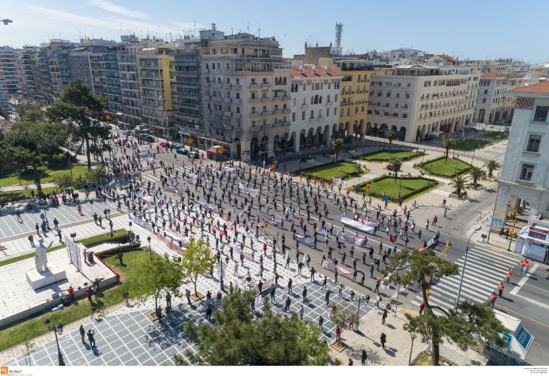 Die traditionelle Erste-Mai-Kundgebung der kommunistischen Jugend Griechenlands PAME diesmal mit Abstandsmarkierungen und Masken, in SALONIKI (Pressefoto)…
