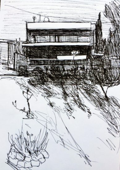 Wem gehört wohl dieses ach so moderne Haus, dessen Fenster sich gegen die Außenwelt wehren, sich total abschotten und keinen Blick ins Innere zulassen und wer legte, aus welchen Gründen diesen Steingarten an?