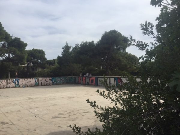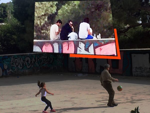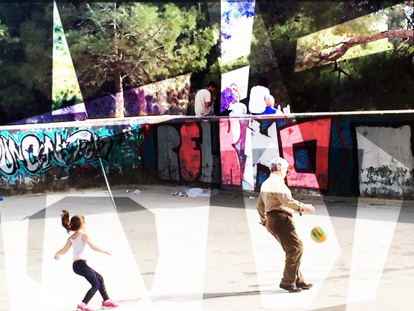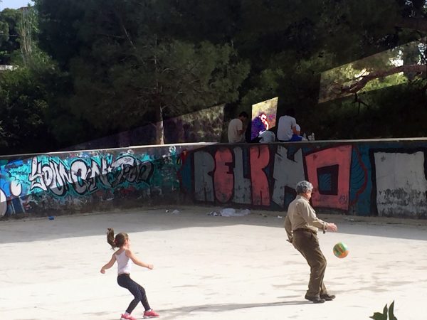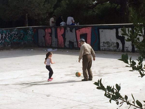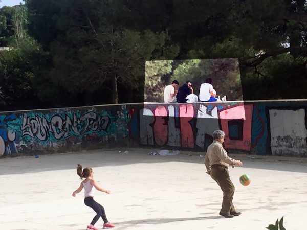 Die Distanz zwischen mir und den Menschen dort unten ist „in Wahrheit“ viel größer als sie hier erscheint, denn ich habe die Szene herangezoomt, während ich selbst, halb verdeckt von einem Feigenbaum, am anderen Ende der Dexameni sitze. Die wahre Distanz würde etwa so aussehen: