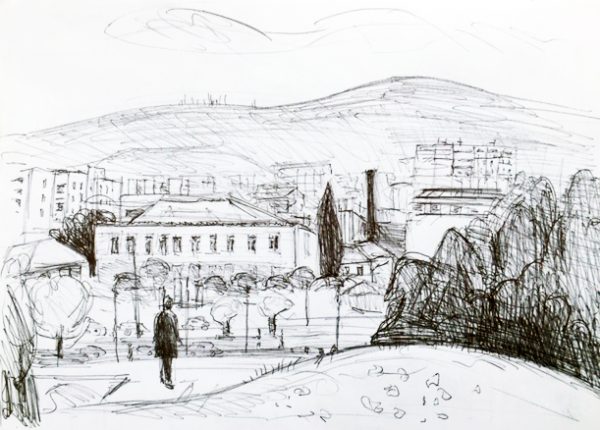 Gezeichnet habe ich das Motiv, das ich gestern als Foto zeigte, aber näher herangerückt, denn ich sitze auf halber Höhe des ansteigenden Geländes.  Zur Komposition: Das Standbild von Venizelos bildet mit einer Zypresse und einem hohen gemauerten Schornstein – Überbeibsel aus anderen Tagen – eine Diagonale, die Gipfellinie des Hymettos wiederholt sich in der Hügellinie des Vordergrunds. Die dunkle Masse der Bäume rechts bildet einen Gegensatz zur architektonischen Ordnung des klassizistischen Gebäudes im linken Zentrum und den hellen gestutzten Bäumen davor.
