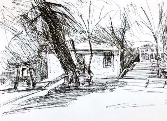 Ein Blick in die andere Richtung. Das alte jetzt geschlossene Gebäude mit der imposanten Treppe  dient der Gemeinde Athen als Ausstellungsraum. Im Schatten einer hohen Pinie sitzen und stehen vier Jugendliche, die ich im gestrigen Foto herangezoomt habe, hier aber nur andeute. Heute vormittag erhielt ich Besuch von einer Nachbarin,  und ich ergriff die Gelegenheit, sie zu skizzieren, wie sie vor dem blühenden Rosenstrauch sitzt und zeichnet. Ja, sie zeichnete auch, den Baum gegenüber. Effi hat an der Kunstakademie studiert und ist Malerin, skizziert aber auch gern mit Bleistift, wie hier. Zum ersten Mal zeichneten wir gemeinsam. Ich hoffe auf noch viele Gelegenheiten dazu! Denn nichts finde ich anregender, als mitzuerleben, wie andere ein Thema auffassen.