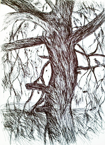 Ich zeichnete den Baum heute gegen 7 Uhr abends vom selben Platz aus, aber mit Kugelschreiber. Sofort fällt auf, dass ich spontan das Hochformat wählte, obgleich der sichtbare Bildausschnitt (Foto) ein Querformat nahelegt. Ich beugte mich vor, um etwas mehr von der Krone zu sehen und so das Hochformat zu rechtfertigen. Dadurch setzt sich der leicht tänzerische Schwung des gewaltigen Stammes im Astwerk fort. Beide verzichteten wir darauf, den Gitterzaun zu zeichnen – wobei ich natürlich nicht wissen kann, ob Effi vorhatte, ihn einzubeziehen. Ich bin gespannt, wie sie es handhaben wird, falls sie, wie geplant, die Zeichnung fertig macht. Ich mag ihre Zeichnung allerdings auch im „unfertigen“ Zustand sehr.