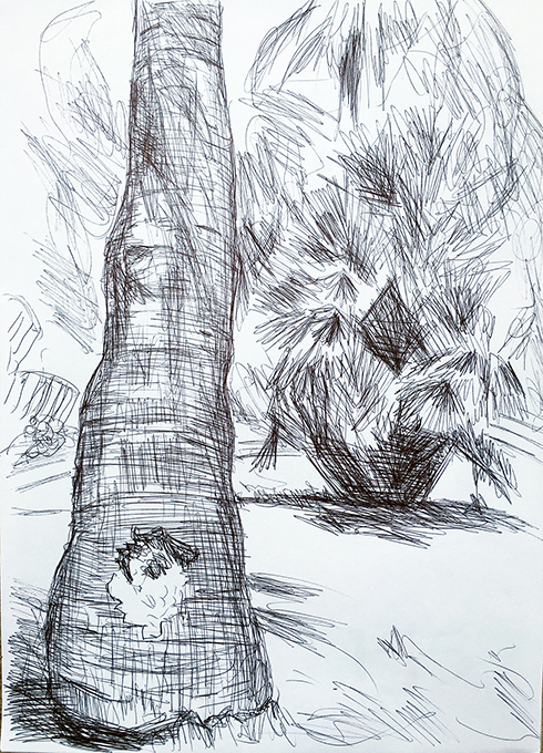 Heute nutzte ich eine Wartezeit, um, bequem auf einer schattigen Bank auf dem Vorplatz des Archäologischen Nationalmuseums sitzend, den Stamm einer Palme zu zeichnen (das Museum ist nochgeschlossen). Riesenhoch ragte der Stamm vor mir auf. Die Blattwedel sah ich nur in Form der Schatten, die sich auf dem Stamm abbildeten. In einiger Entferrnung wuchs eine junge Palme, diese nun fast ohne Stamm, dafür aber mit einer reichen Blätterkrone.
