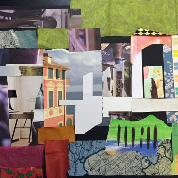 Mir gefällt die Reihe mit der „Landschaftsarchitektur“, die durch das große Stück mit der Hausfassade am Meer vorgegeben wird, zwar recht gut, aber: ich möchte doch eigentlich noch andere Geschichten erzählen. Ich suchte alle Stücke, die irgendwie an Figürliches erinnerten, zusammen, und baute daraus eine Gestalt, die ich schrägt ins Bild setzte. Ein Mensch wurde es nicht, eher eine künstliche Intelligenz. Oder vielleicht ein Wachtmann, der eins mit seiner Bude geworden ist – so wie man sie an manchen Uhrwerken bewundern kann.