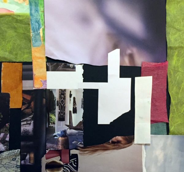 Ein zweiter Versuch begann damit, dass ich auf der Rückseite der „Villa“ einen Reklame-Mann entdeckte. Den baute ich in die übrigen Materialien so ein, dass der mir unerträgliche Reklame-Supermann-Ausdruck durch Mundschutz und weibliche Haarteile gemildert wird. Trotzdem bleibt sein Auge im tief gestaffeltenRaum dominant.