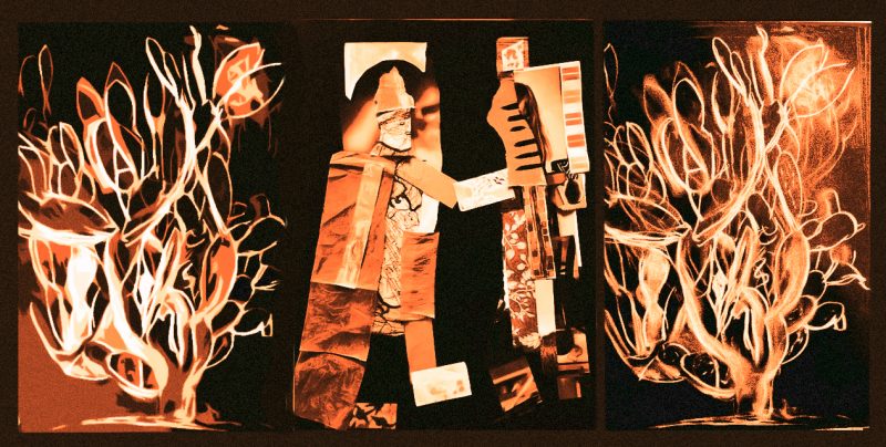 Musik sehe ich auch mit der Frau assoziiert (Klaviatur). Die Büsche sind übrigens ein Feigenkaktur, den ich zeichnete und auf zwei verschiedene Weisen fotografierte, dann entfärbte und neu einfärbte. Außer mit dieser feurigen Farbe auch mit Blau.