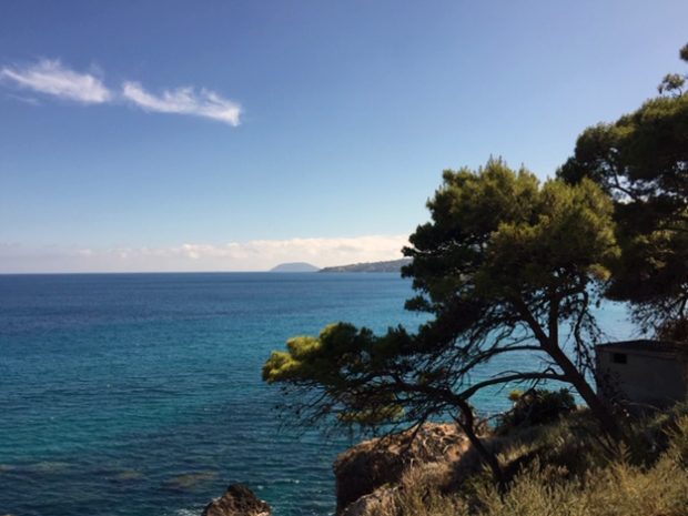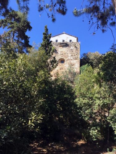 Gestern gingen wir oberhalb des Ortes spazieren. Der stille von Vogelgesang und Licht-Schatten belebte Allee, die zu einer bedeutenden alten Kirche führt, gibt den Blick frei auf das weite Meer einerseits, auf Klosterkirchen und Burgbefestigung andererseits.