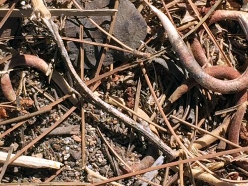 Ja, geschaut haben wir, aber da war nichts. Drüber nur Pinien. Die „Würmer“ sind von irgendwelchen Bodengewächsen. E, die sich mit Pflanzen ausgezeichnet auskennt, wusste auch keinen Rat.