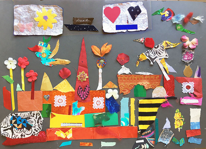 Und was war mein erster Einfall, als ich dies neue Material auf einer großen schwarzen Pappe ausgebreitet hatte? Eine orientalische Märchenstadt, bewohnt von exotischen Vögeln und Blumen.