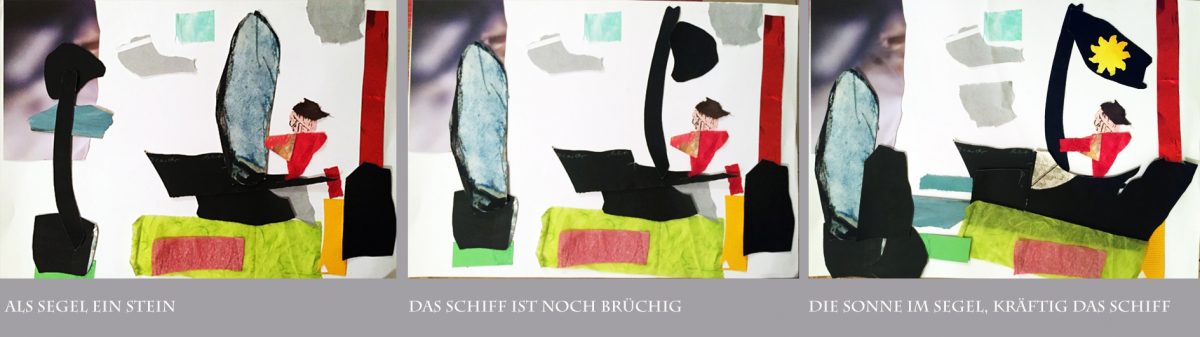 Im Endbild ist das Segel der ersten Variante als Fels an die Küste hinausgesetzt. Jetzt nmmt das Schiff  Fahrt auf in Richtung des offenen Meeres. „Ins Blaue“.  Schiff und Hand des Bootsführers sind verstärkt, das Segel ist entfaltet und mit einer Sonne bestückt, der rote Streifen steht senkrecht. Das Legematerial stammt von Jürgen Küster, Susanne B, Bruni Kranz und mir.