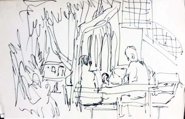 Hast du keinen Skizzenblock zur Hand, kannst du auch die Vorsatzseiten von Büchern zum Zeichnen verwenden. Ich hatte zum Glück was Passendes dabei, als ich eine Espresso-Pause am Bahnhofsmuseum von Kalamata einlegte. Unterdessen ging mein Mann einkaufen.  Er hat kein Problem mit der Maskenpflicht in Supermärkten, findet sie vollkommen in Ordnung – daher überlasse ich ihm gern das Einkaufen.