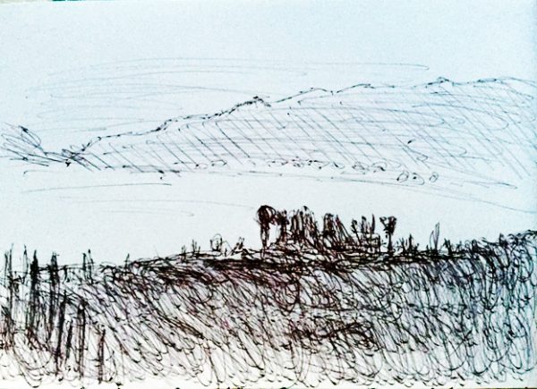 Auf der Turmterrasse: abendliche Landschaft und Raumarchitektur (tägliches Zeichnen)
