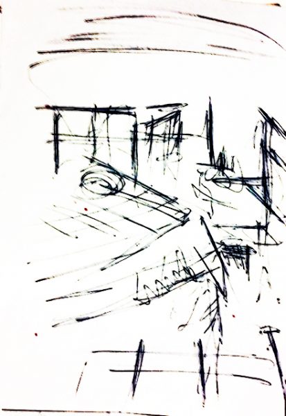 Auf der Turmterrasse: abendliche Landschaft und Raumarchitektur (tägliches Zeichnen)