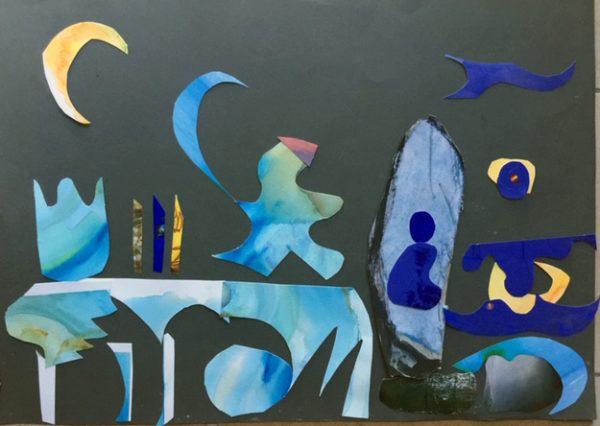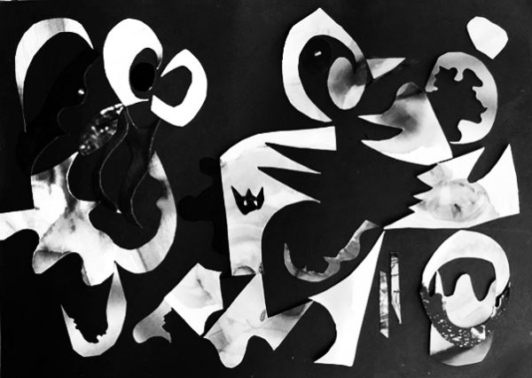 Ich machte dann noch ein zweites Bild, bei dem ich die Schnipsel so legte, dass nicht nur Positiv- sondern auch Negativformen entstanden – mit der Absicht, es digital in eine Schwarz-Weiß-Version umzuformen.