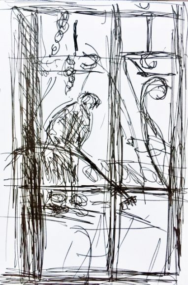 Draußen vor der hinteren Eulengittertür wuselte Giorgos herum. Er ist ein Schneller. Den Efeu hatte er bereits zurückgeschnitten, die kaputten Fliesen herausgenommen, neue Abflüsse für das Regenwasser gelegt, eine Umrandung gemauert …, nun fegte er und reinigte den Hof mit dem Schlauch. Seine Bewegungen waren so schnell, dass ich keine Chance hatte, eine Position zu studieren. Aber einen Eindruck von seiner flinken, leicht gedrungenen kräftigen Gestalt vermittelt die Skizze doch.