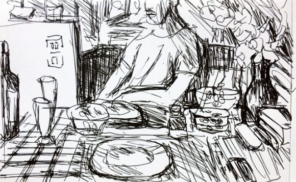 Ruhiger verhielt sich der Koch des heutigen Mittagsmenüs (Artischocken, Kartoffeln und Erbsen in Dillsoße) – jedenfalls, solange er müde am bereits gedeckten Tisch saß und darauf wartete, dass das Gemüse gar wurde. Sein Kopf passte leider nur halb auf den handgroßen Zeichenblock.