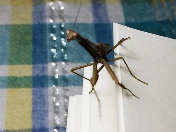 Gestern Nacht wars eine Gottesanbeterin, die auf den Seiten meines Buches Halt suchte. Ich war froh über diese Unterbrechung, denn die Lektüre war deprimierend und ich konnte eine Pause gut gebrauchen. (Am liebsten würde ich das Buch in die Ecke feuern, aber ich hab grad nix Gescheites zu lesen, auch möchte ich wissen, ob diese zusammengeflickten Romanfiguren am Ende doch noch so was wie einen Charakter offenbaren*).