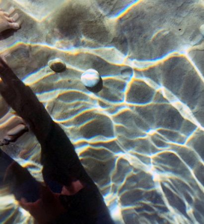 Trotz der „Piranhas“ blieb ich bewegungslos im Wasser stehen.  Wie sieht es mit den Schatten aus, die die Dinge werfen, auch wenn sie im Wasser liegen? Wird mein Schatten den ihren auffressen? Wird sich dann die Plastizität des Steins verlieren, und zurück bliebe nur eine flache Scheibe? Versuch macht klug.