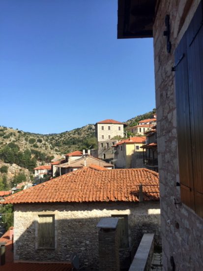Bilder von Arkadien (1) Dimitsana: blaue Blume mit Riesenbiene, der Ort, die Geschichte