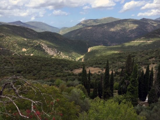im Tal die byzantinische Kirche mit Zypressen