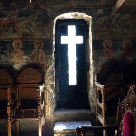 ← Selfie mit junger Katze sowie das „Kloster des Philosophen“ bei Dimitsana, Arkadien